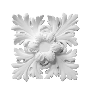 R-301 to wyjątkowa, ornamentalna rozetka gipsowa, która zachwyca bogactwem klasycznych detali. Centralny motyw kwiatowy otoczony czterema rozłożystymi liśćmi akantu tworzy efektowną, pełną dynamiki kompozycję charakterystyczną dla stylu pałacowego, klasycystycznego i francuskiego.