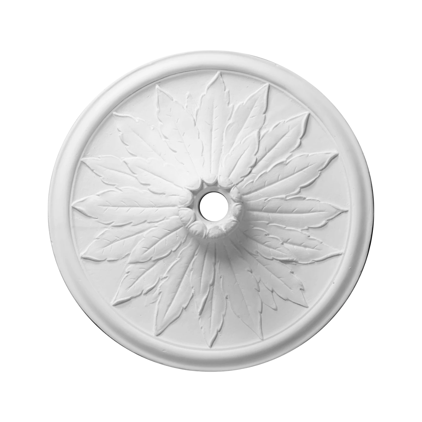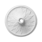 R-303 to subtelna, a jednocześnie wyrazista rozeta gipsowa, której głównym motywem są promieniście ułożone liście o precyzyjnie zaznaczonej fakturze. Ich miękko modelowane krawędzie tworzą naturalny, roślinny układ nadający całości elegancji i lekkości.