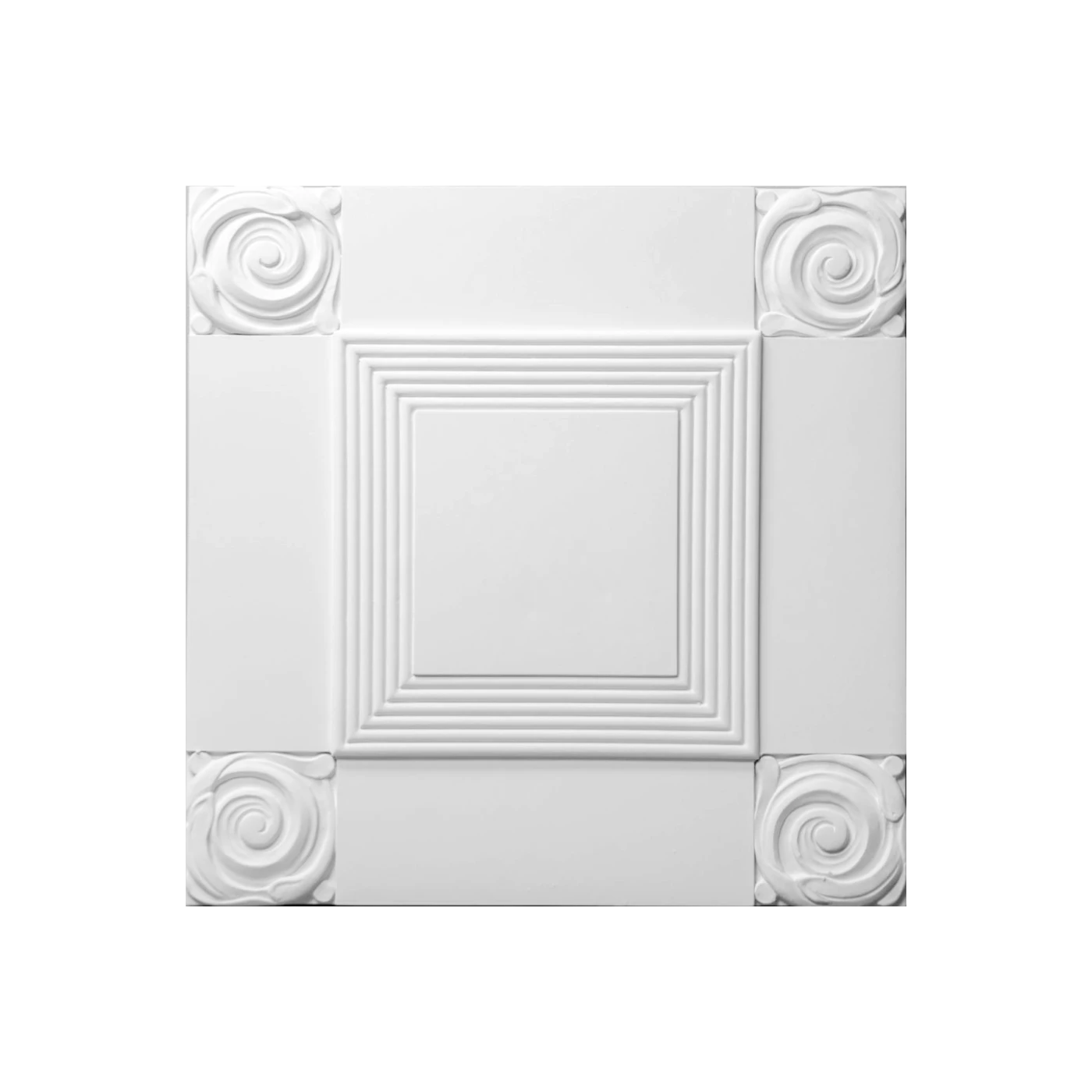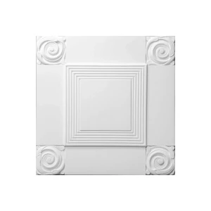 Rozeta R-307 to wyjątkowy model inspirowany klasycznymi kasetonami sufitowymi. Łączy w sobie symetrię, wyrazistą geometrię oraz subtelne ornamenty roślinne umieszczone w czterech rogach. Centralna część rozety zbudowana jest z kilku precyzyjnie profilowanych ram, które prowadzą wzrok do minimalistycznego środka.