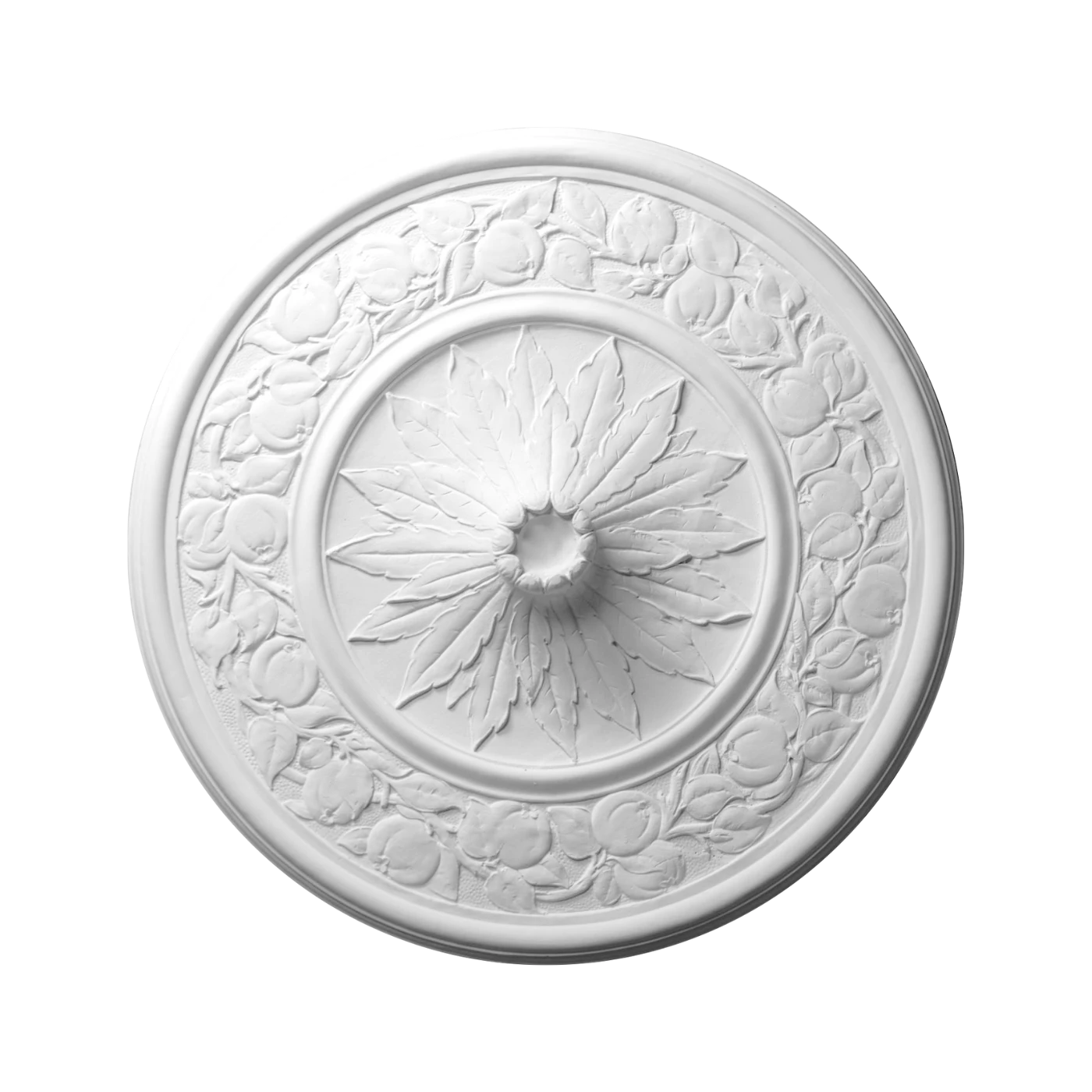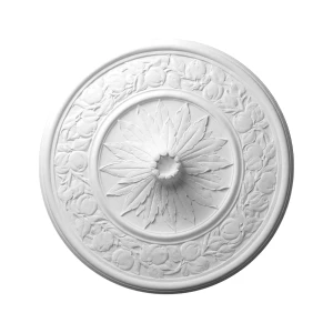 Model R-316 to okazała, elegancka rozeta gipsowa o bogatej, klasycznej dekoracji. Jej forma łączy w sobie dwie warstwy zdobień: efektowny, roślinny motyw w centrum oraz misterny, gęsto rzeźbiony wieniec owoców na obrzeżu.