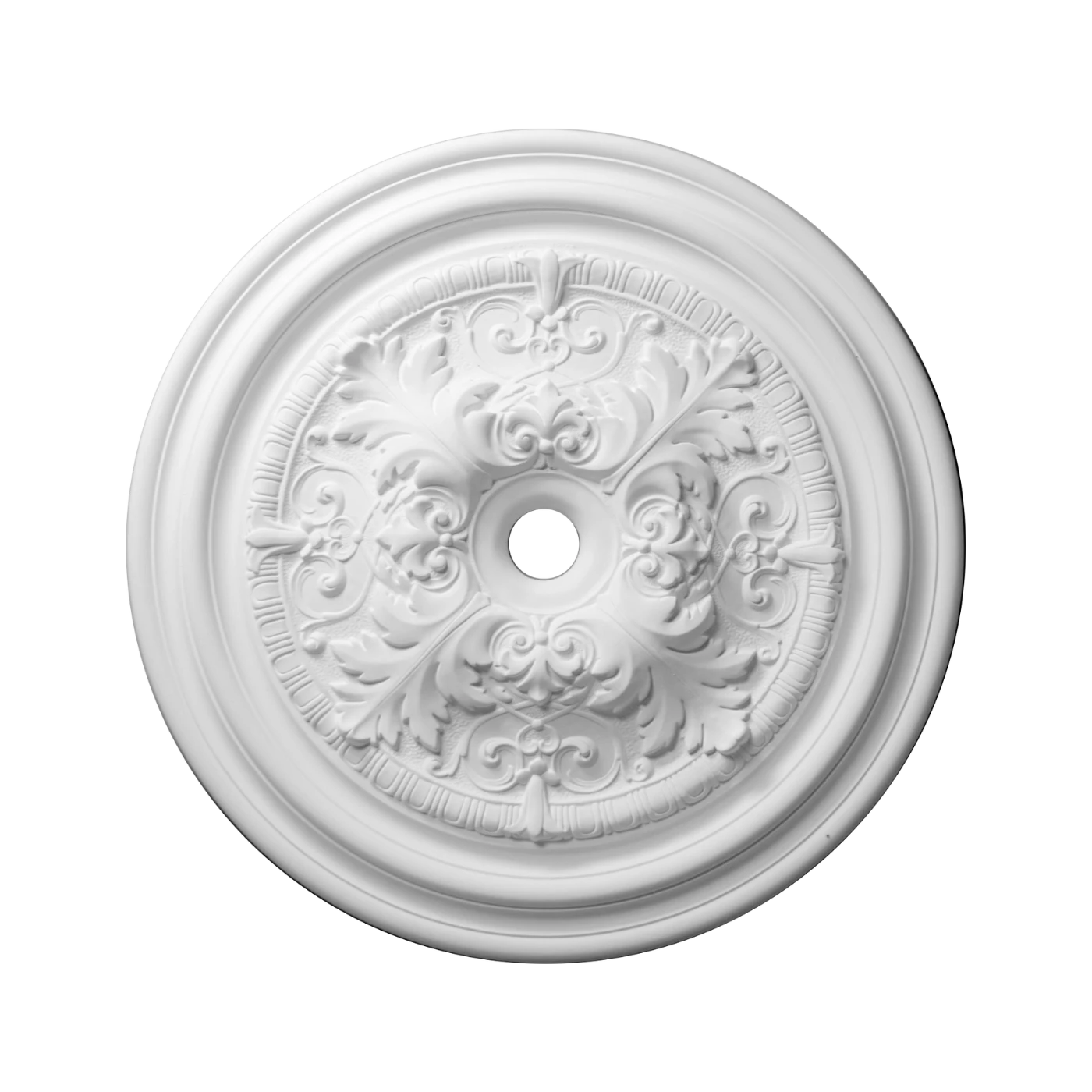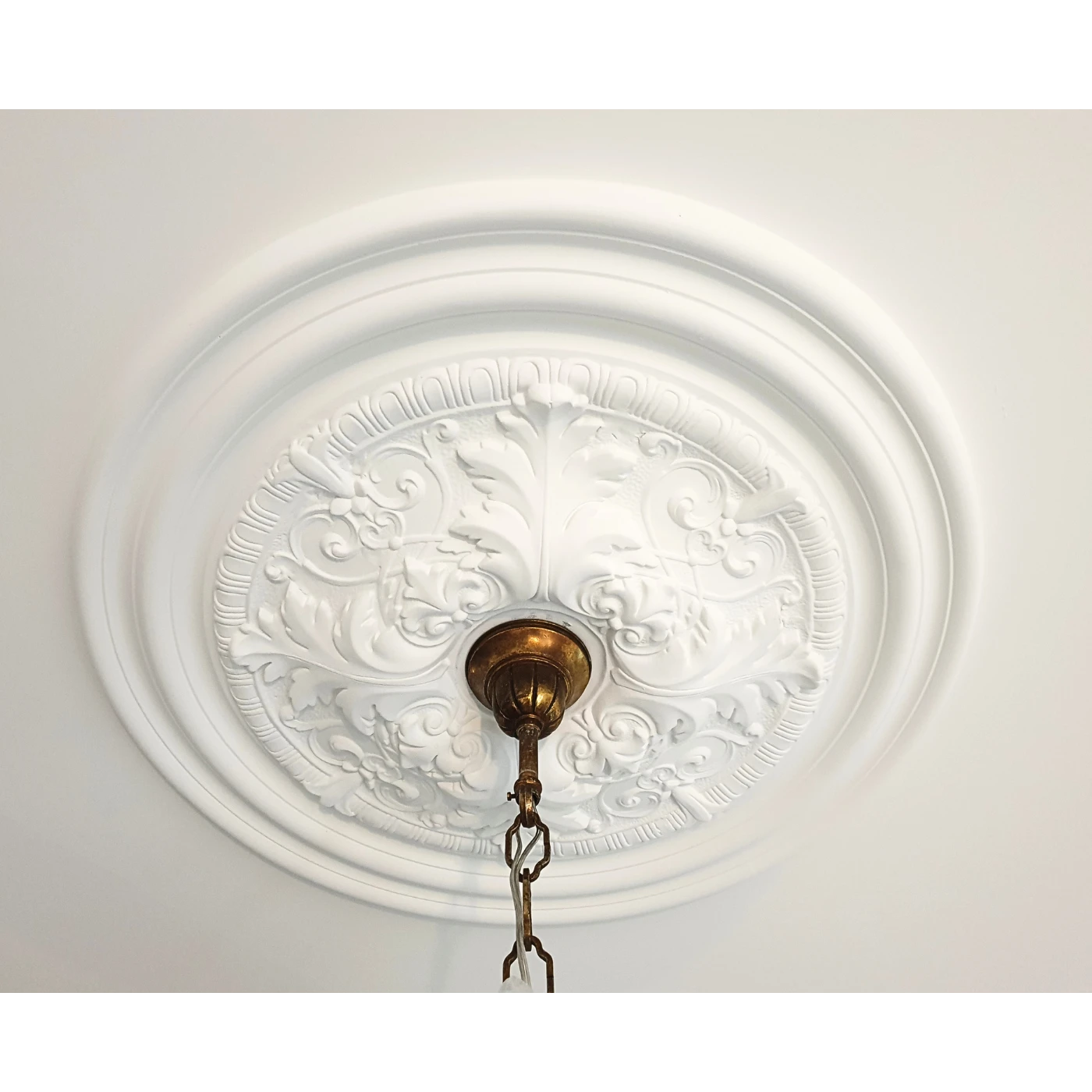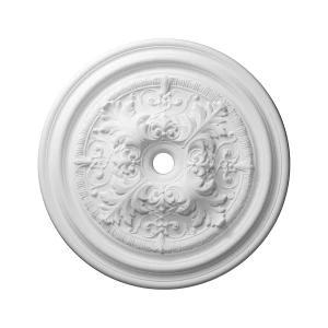 Zewnętrza obręcz rozety R-317 pozostaje spokojna i gładka, dzięki czemu odważny ornament w części środkowej jest pięknie wyeksponowany, nie tracąc równowagi kompozycyjnej. Detal został odwzorowany precyzyjnie – ostrze rzeźby, głębokie załamania i przestrzenne przejścia światła podkreślają charakter dekoracji wykonywanej tradycyjnymi technikami sztukatorskimi.