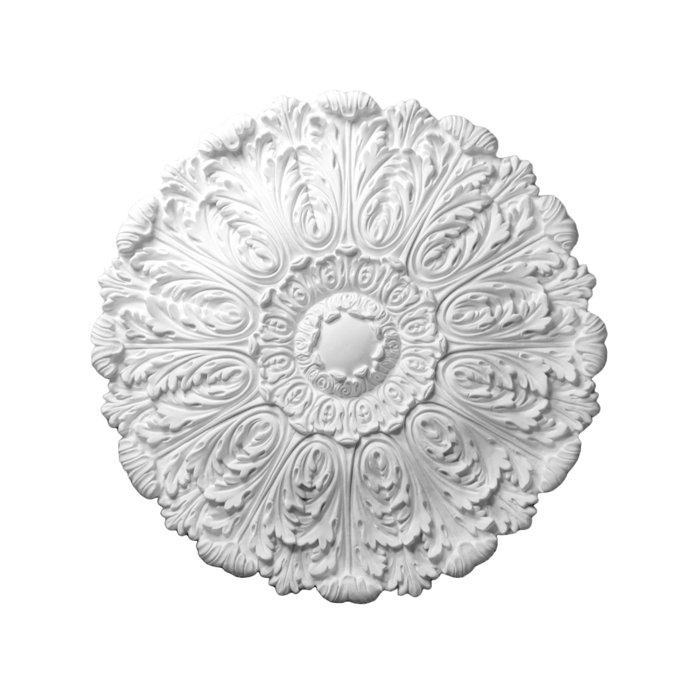 Rozeta sufitowa gipsowa R-331 - Rozeta gipsowa z promieniście ułożonych i nachodzących na siebie liści akantu, w środku pierścień z mniejszych liści. Rozeta do bardzo bogatych stylizowanych wnętrz. Produkt rzemieślniczy wykonany z gipsu sztukatorskiego.