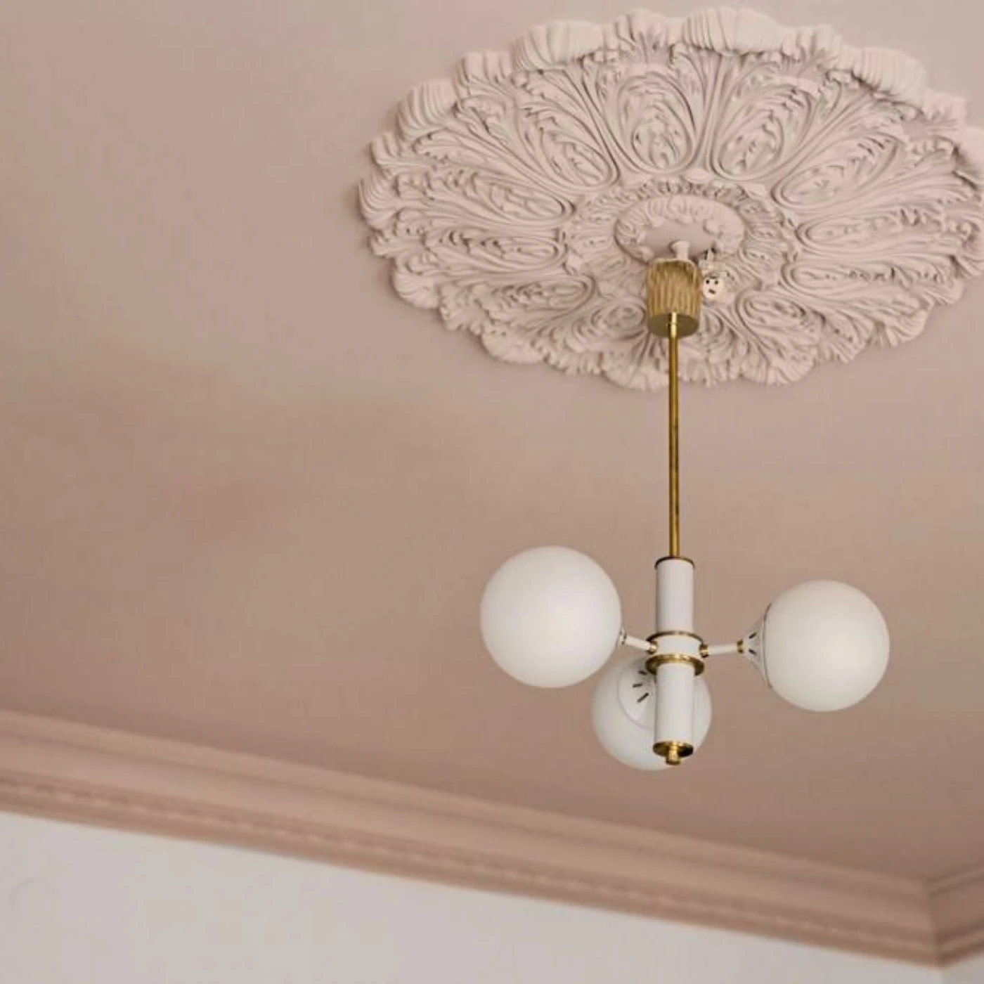 Centralna strefa przygotowana pod montaż oświetlenia – eleganckie wykończenie żyrandola lub lampy.