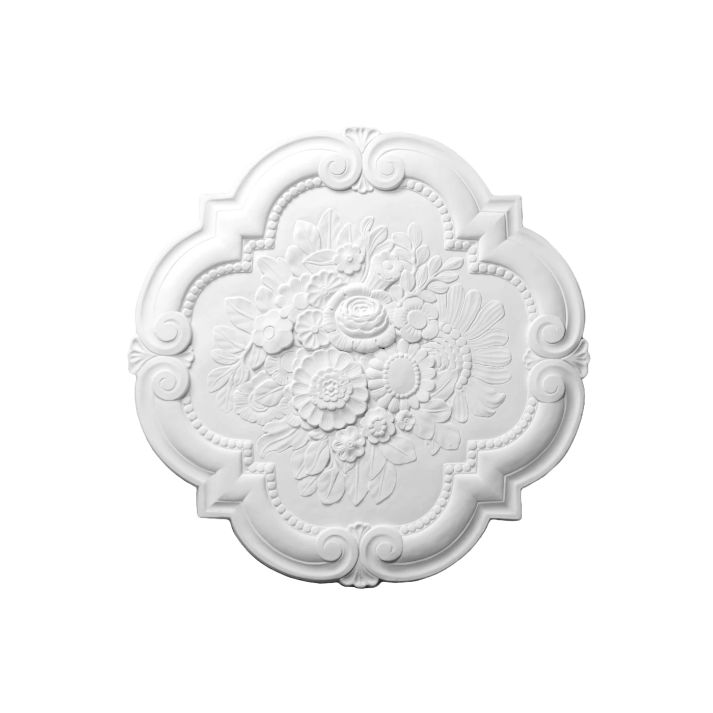Rozeta sufitowa gipsowa R-333 - Rozeta o nieregularnym kształcie z obfitym motywem kwiecistym i obramowaniem z perełkami przechodzącym w woluty. Sztukateria produkowana z gipsu ceramicznego według tradycyjnych metod i materiałów.