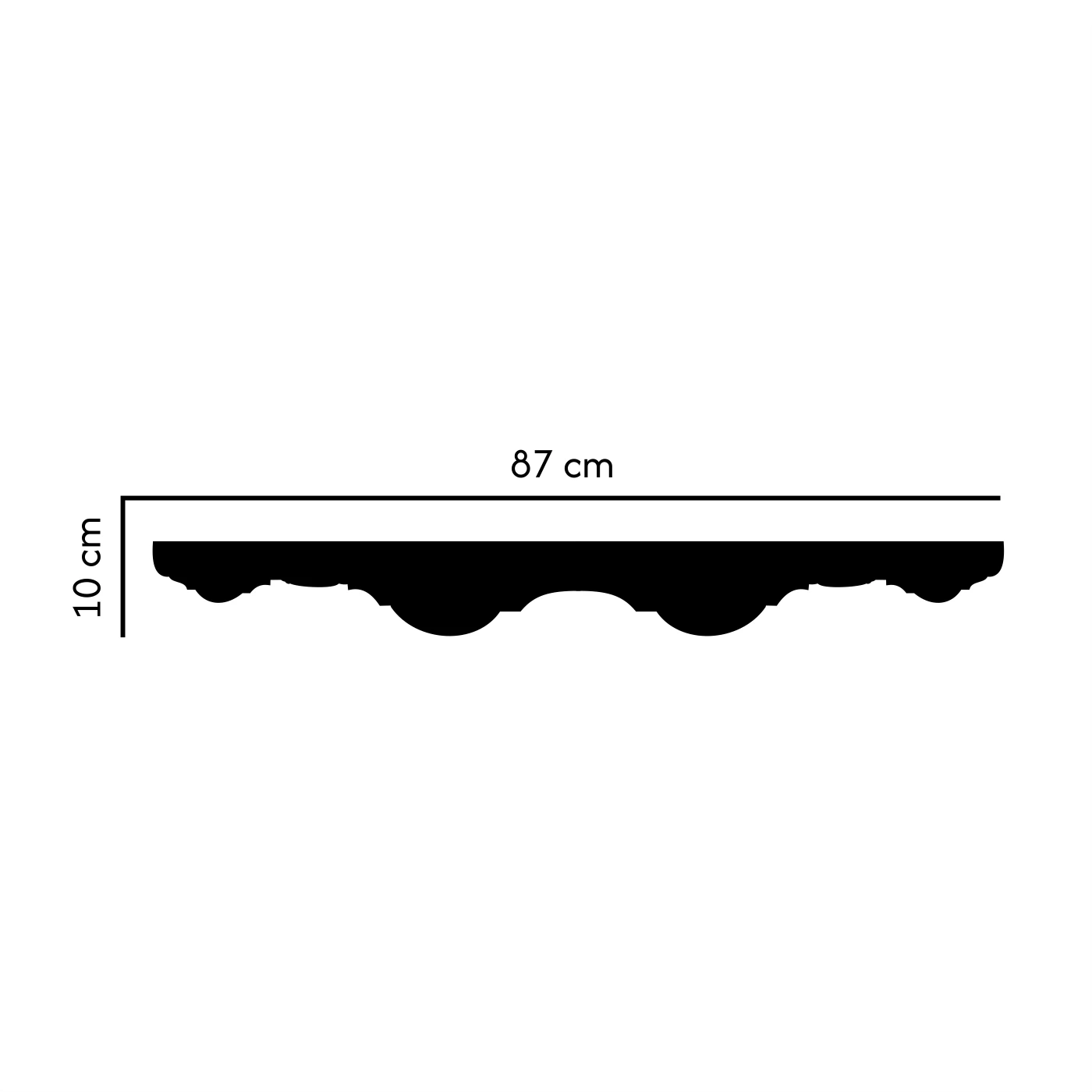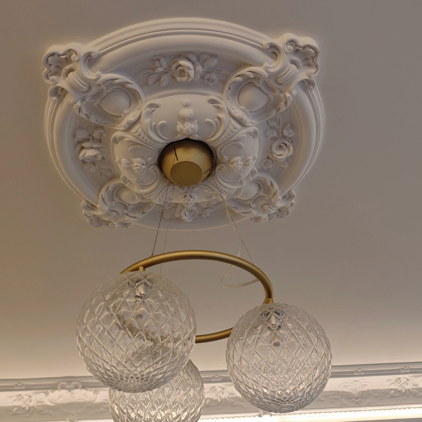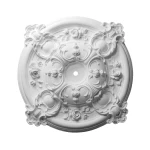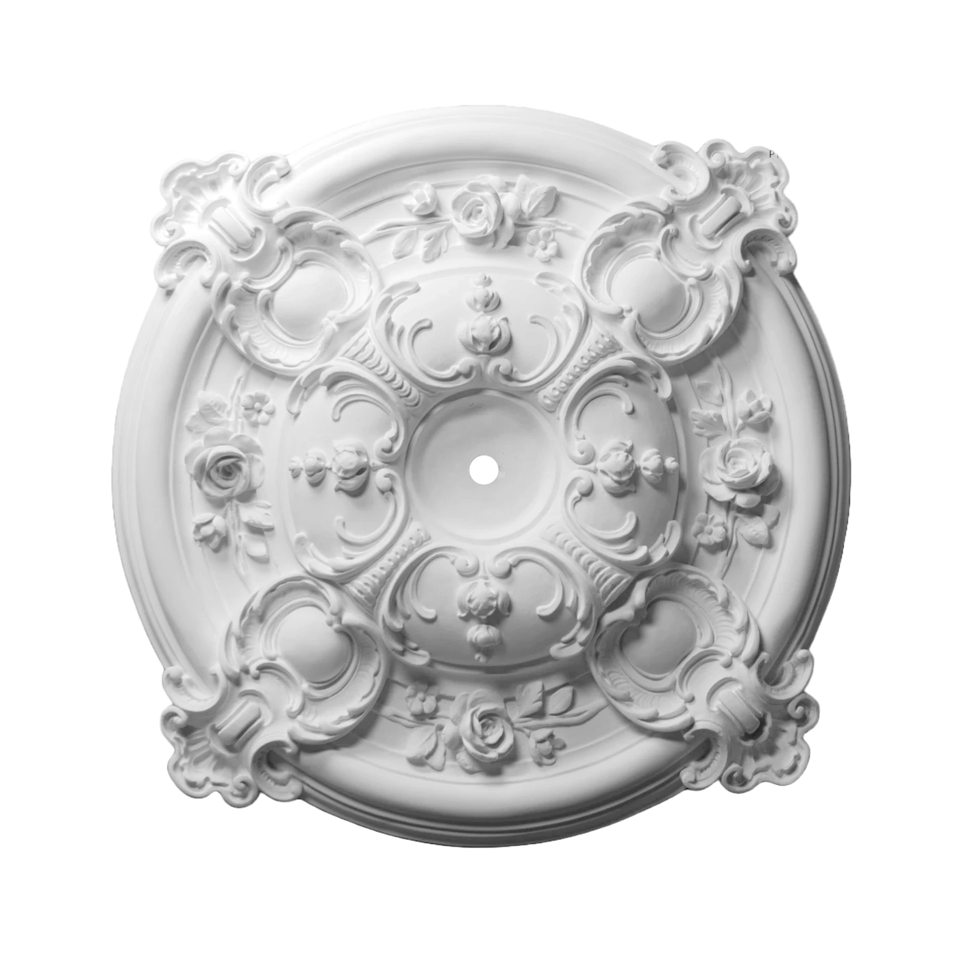 Rozeta R-335 to niezwykle ozdobny model utrzymany w eleganckiej stylistyce neorokoka, gdzie dominują miękkie, płynne linie, ornamentalne woluty oraz subtelna symetria charakterystyczna dla XVIII-wiecznej dekoracji. Centralną część rozety tworzy delikatnie uwypuklony medalion, wokół którego rozchodzą się cztery bogato profilowane kartusze o miękkich, fantazyjnych kształtach. Ich forma podkreślona jest drobnymi, kunsztownie wykonanymi zdobieniami inspirowanymi historycznymi sztukateriami.