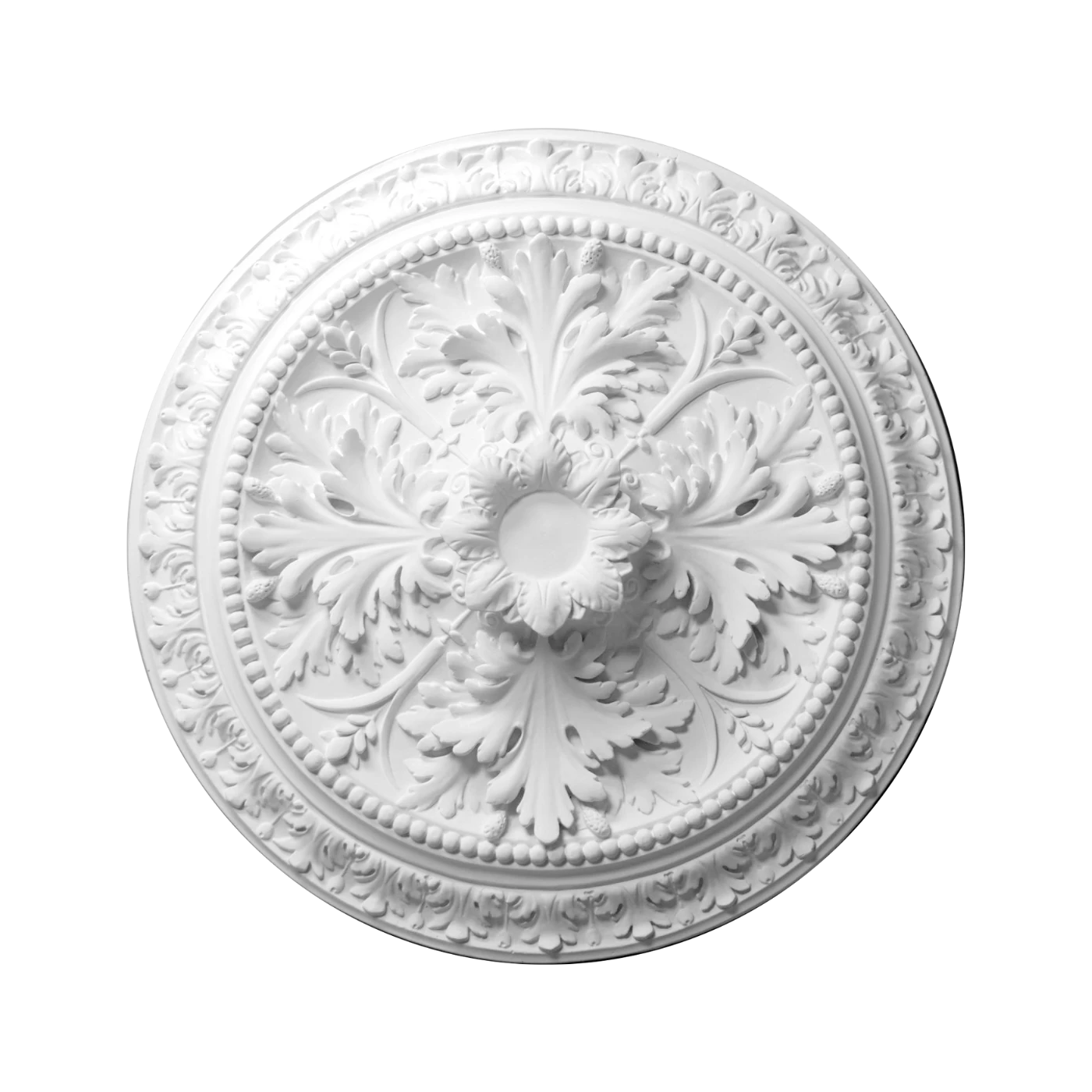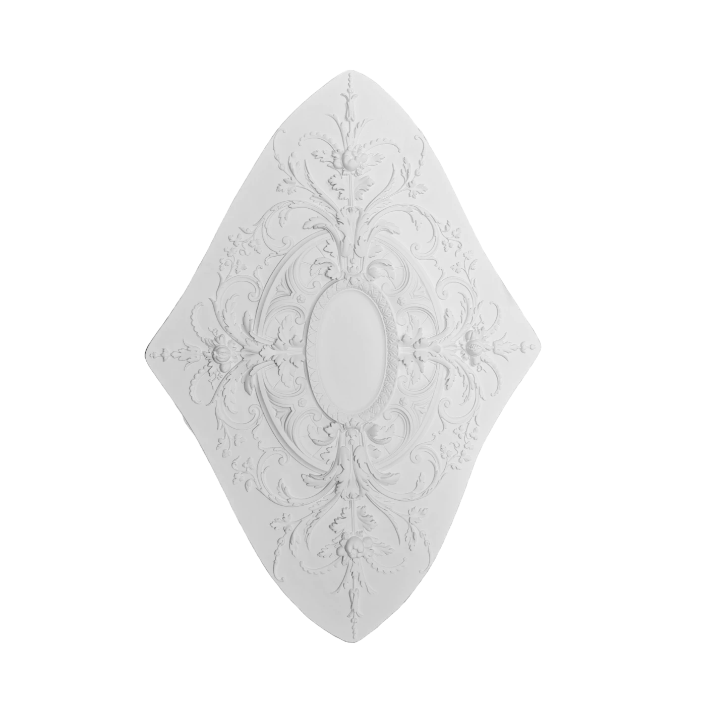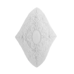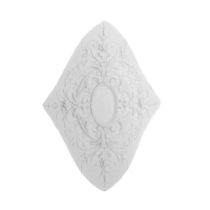 Rozeta R-338 to niezwykle dekoracyjny model o charakterystycznym, diamentowym kształcie, który natychmiast przyciąga uwagę. Jej projekt opiera się na swobodnie rozbudowanej, rokokowej ornamentyce pełnej płynnych linii, finezyjnych wolut oraz misternie ukształtowanych liści akantu. Centralną część wypełnia owalna rama – idealna jako subtelny punkt dekoracyjny lub przestrzeń na niewielki element oświetleniowy.