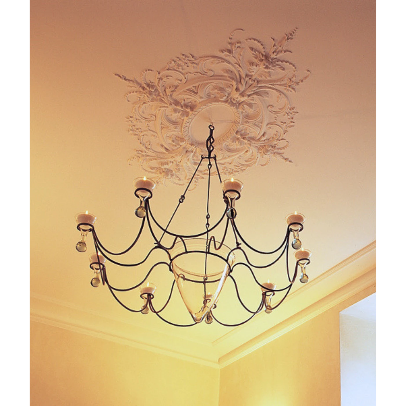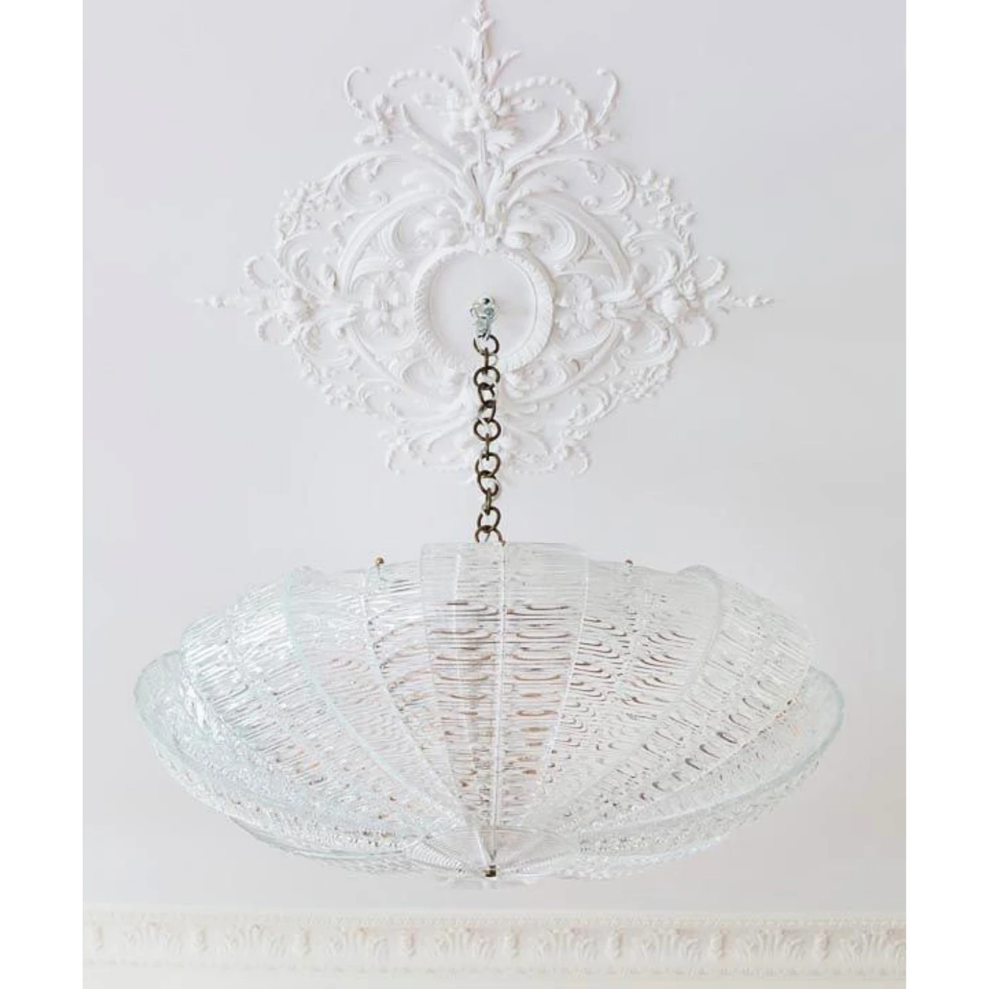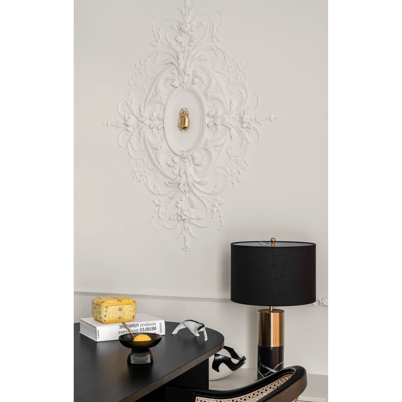 Z każdego z czterech kierunków od owalnego centrum rozchodzą się symetryczne, bogate zdobienia, tworzące wrażenie lekkości i harmonijnego przepływu. Zdobienia roślinne są precyzyjne i delikatne, a ich liniowy charakter typowy dla rokoka dodaje kompozycji elegancji i dynamiki. Nietypowy kształt rozety sprawia, że doskonale sprawdzi się ona jako dekoracyjny akcent w reprezentacyjnych wnętrzach – zarówno klasycznych, jak i stylizowanych.