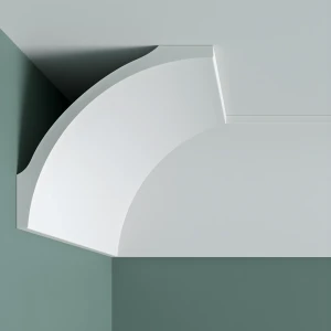 Listwa sufitowa gipsowa F-257 to wzór, który od razu przyciąga uwagę swoją wyjątkową formą. Jej szeroki, łagodnie zakrzywiony łuk spotyka się z ostrą linią krawędzi, tworząc subtelną grę kontrastów – miękkości i precyzji, lekkości i architektonicznej siły.