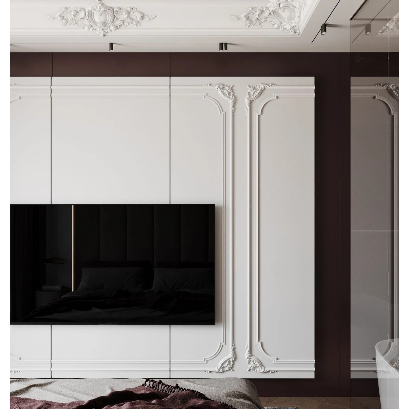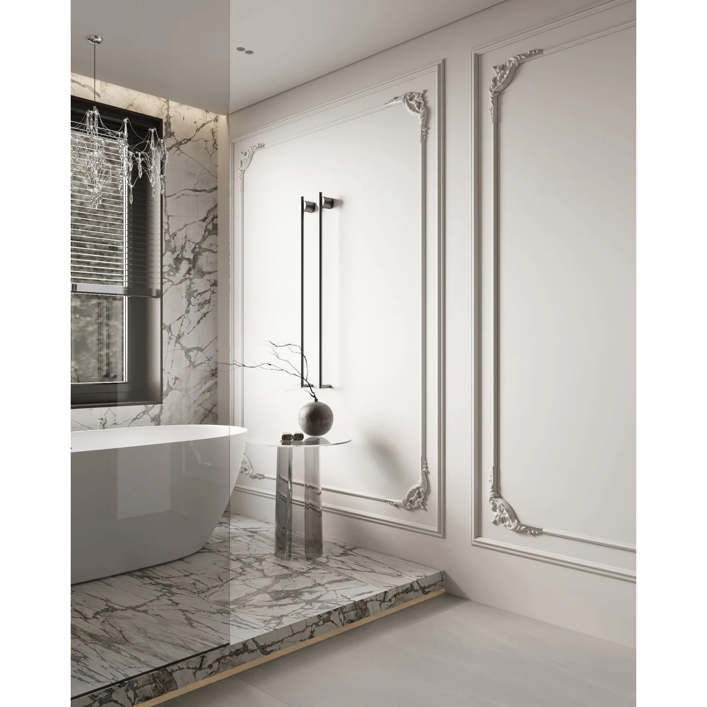 To klasyka w najlepszym wydaniu – symetryczna, lekka forma inspirowana XVIII-wieczną sztukaterią pałacową, która nadaje wnętrzu elegancję i subtelny przepych. Narożnik N-305 pozwala na estetyczne łączenie listew bez konieczności ich przycinania pod kątem, zachowując spójność i ciągłość dekoru.